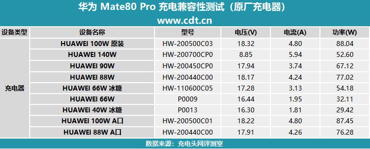 使用HUAWEI原装100W充电器为华为Mate80 Pro充电,实测功率为18.32V 4.80A 88.04W。