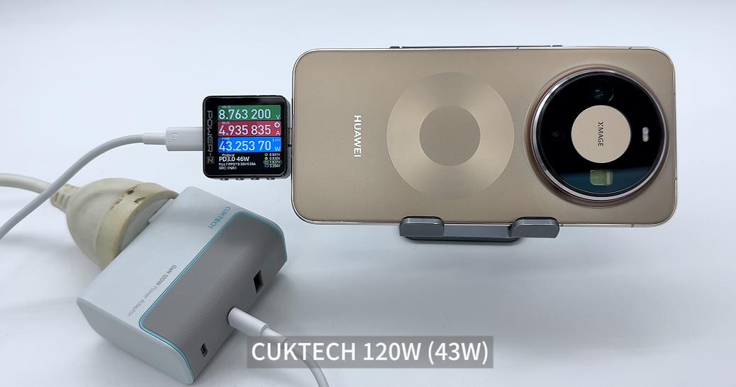 使用CUKTECH 120W充电器为手机进行充电,使用 POWER-Z KM003C 测试仪读取充电功率为8.76V 4.94A 43.25W,握手的协议为PPS协议。