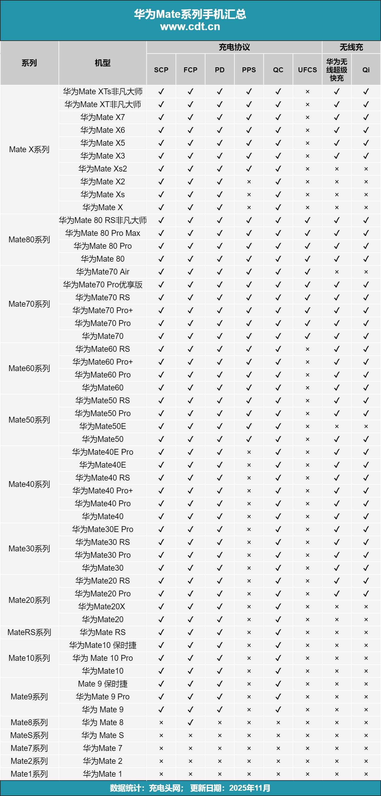 此次充电头网也汇总了华为历代Mate系列的私有协议支持情况,Mate系列中Mate9系列及以下的机型不支持SCP、FCP,对于华为Mate9-80系列以及Mate X的机型都能适配 SCP、FCP,以及QC协议,此外,Mate80系列也支持PPS以及UFCS快充协议。
