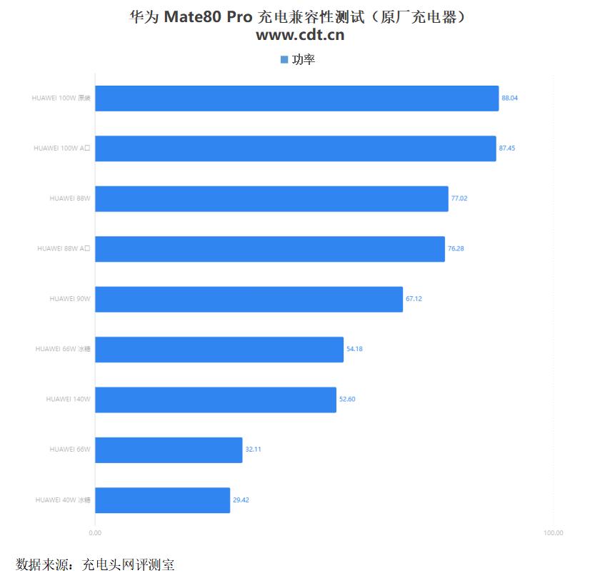 汇总至柱状图,可以看到充电功率最高的是华为100W原装充电器(88.04W),其次是100W A口充电器(87.45W),其余除低功率充电器外,多数充电器都能触发华为快充协议,功率普遍在50-80W区间,整体表现良好。