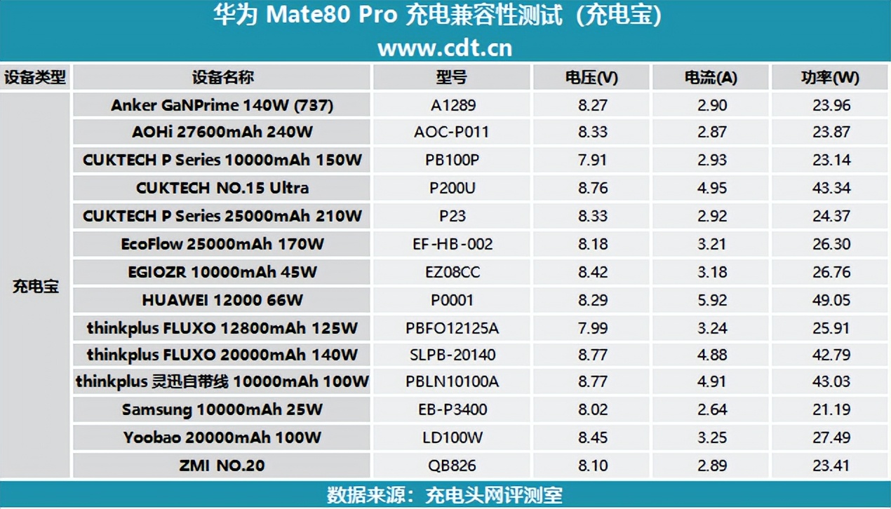 将充电宝兼容性数据汇总至表格,可以看到所测充电宝多数握手9V电压,电流在2-6A之间,功率最高可达49W左右,为HUAWEI 1200 66W充电宝,其他充电宝与第三方充电器差异不大。