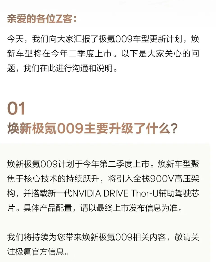 要让消费者不再做糊涂购车人,核心就是让改款信息提前公开,让消费者在购车前就能掌握完整的车型信息。极氪深知消费者的这一痛点,从2025年下半年起推行“产品迭代提前公告”机制,将所有车型的改款、焕新信息至少提前两个月对外公布,让消费者在购车前就能清晰了解车型的发展规划。在极氪 009 焕新计划中,品牌不仅详细公布了核心技术的升级方向,还为选择现款车型的用户推出了限时权益保障,让消费者无需再担心“提车即落伍”,彻底告别了“冤大头”式的购车困境。