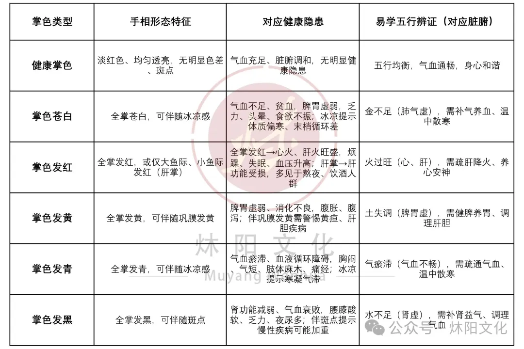 为了让大家更直观、清晰地对照自身手相,读懂健康信号,我们结合推文核心内容,制作了配套手相解析表,按“核心掌纹、特殊纹路、掌色、指形”四大类分类,详细标注每类手相的形态特征、对应健康隐患及易学辨证解读,方便大家对照自查、精准调理。