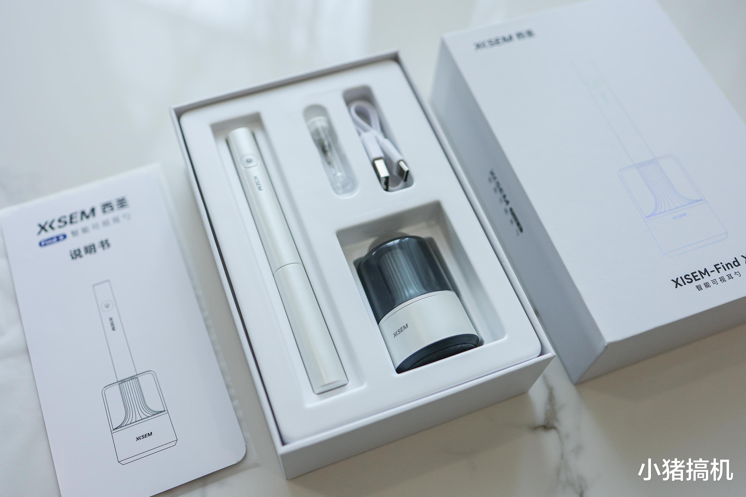 拆开西圣 Find X 包装时,第一反应就是配件真全。白色包装盒印着产品图和卖点,打开后里面整整齐齐摆着一堆东西:挖耳勺主机之外,耳铲头、耳钩头、8 个替换硅胶耳勺套、UVC 消毒底座、Type-C 充电线和说明书一样不缺,光看这配置就觉得挺用心的。