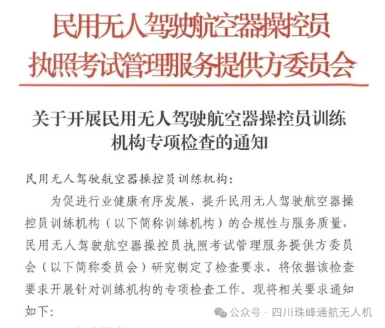 12月31日前,红头文件落地!无人机培训行业大整顿,选对机构是关键 近日,中国航空器拥有者及驾驶员协会、中国地理信息产业协会、中国民航飞行员协会、中国航空运输协会联合发布《关于开展民用无人驾驶航空器操控员训练机构专项检查的通知》,标志着针对民用无人机训练机构的一次全面专项检查正式展开。 本次专项检查安排紧凑,分为两个关键阶段: 检查阶段:自通知下发之日起至11月30日,各机构需接受检查,检查结果须在工作结束后5日内上报; 处置阶段:12月1日至12月31日,对检查中发现的不合规机构,将依法暂停或撤销其合格证资质。