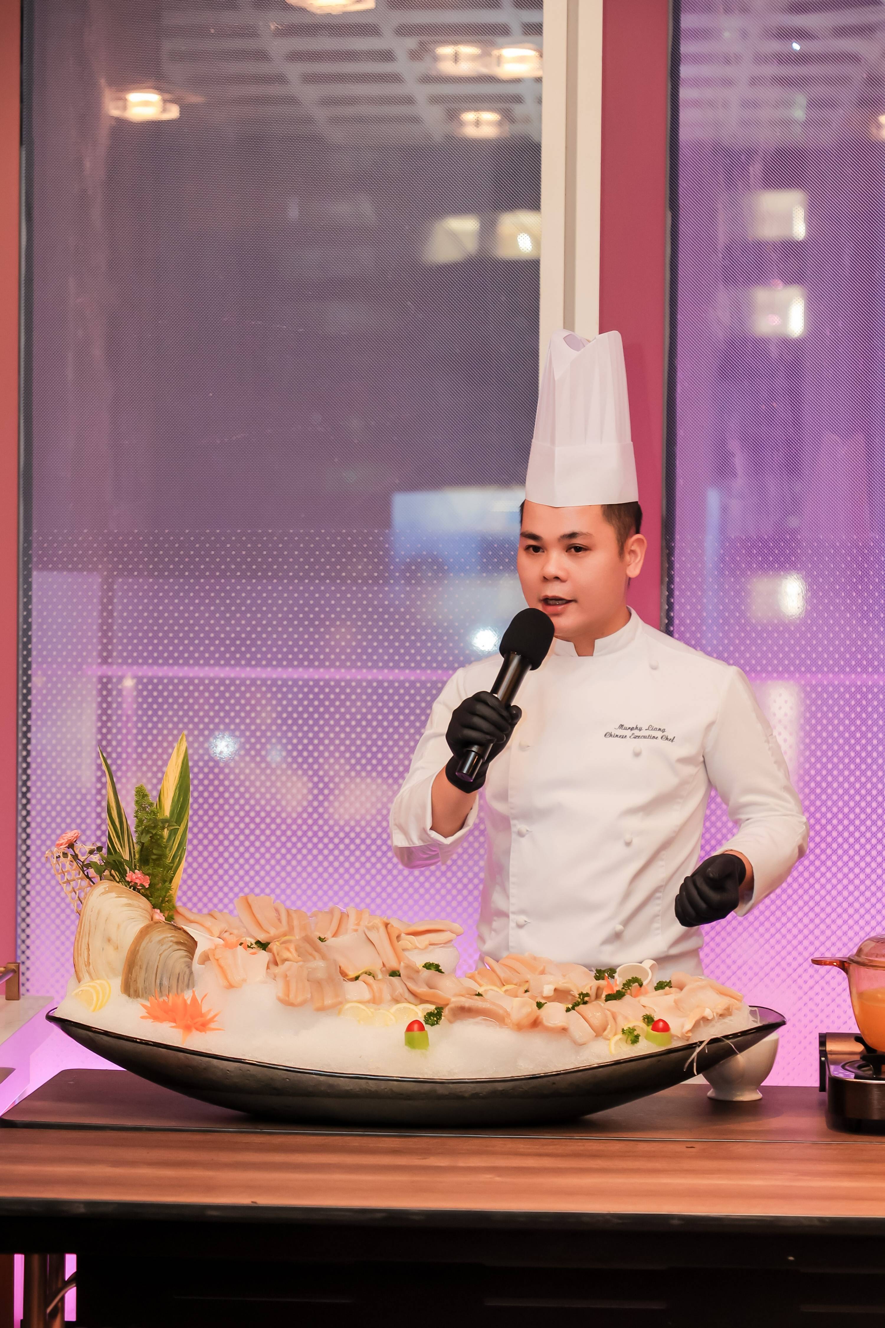 随后,新任中餐行政总厨梁家千师傅及其精英团队正式登台亮相,成为全场焦点。团队以一场精彩的“上菜秀”展示了精湛技艺与创意理念——现场拆解重达十斤的阿拉斯加帝王蟹,将蟹膏、蟹黄及各部位鲜肉细致分装,配以多种风味酱汁,供宾客依个人喜好搭配享用。这场兼具视觉观赏性与互动体验的“蟹”逅,赢得了现场阵阵掌声。