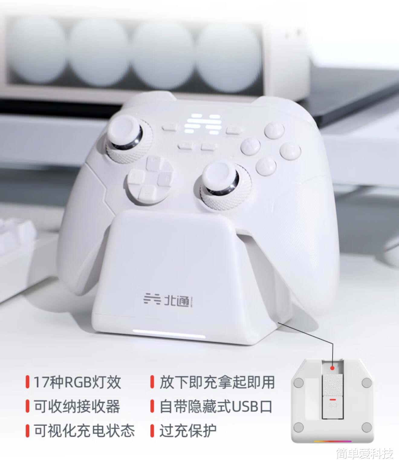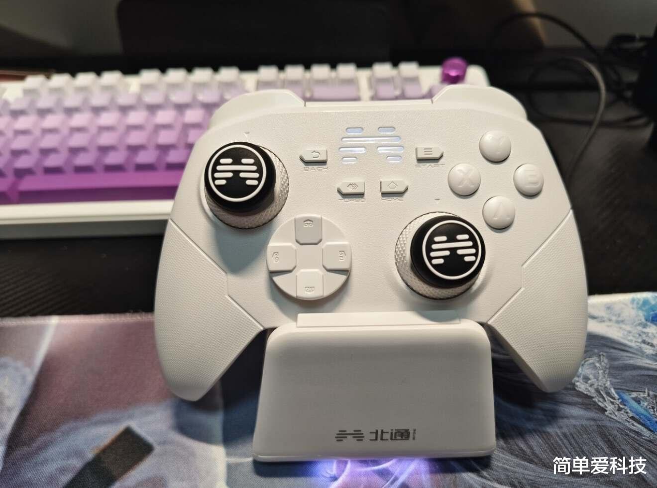 北通鲲鹏20的这个可选充电底座对于小编个人来说特别喜欢,之前手柄不用时只能扔在桌上,乱七八糟的还占地方,北通这个底座既能充电,又能当收纳架,把手柄放上去就像个小摆件,全白配色与桌面也百搭。