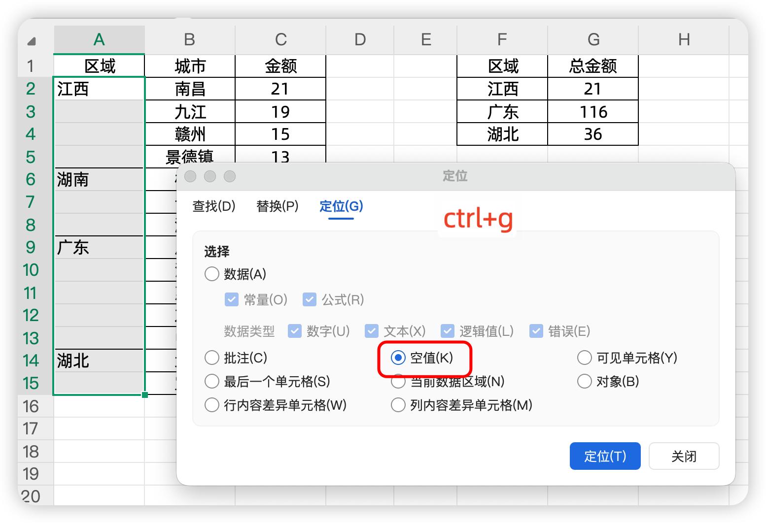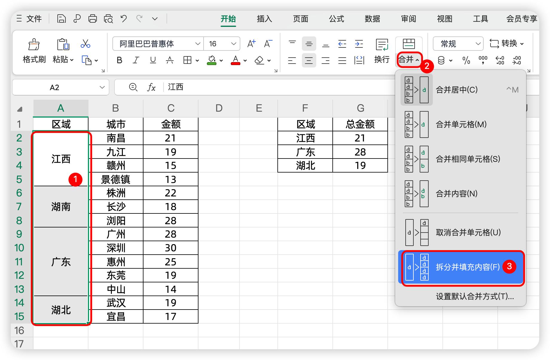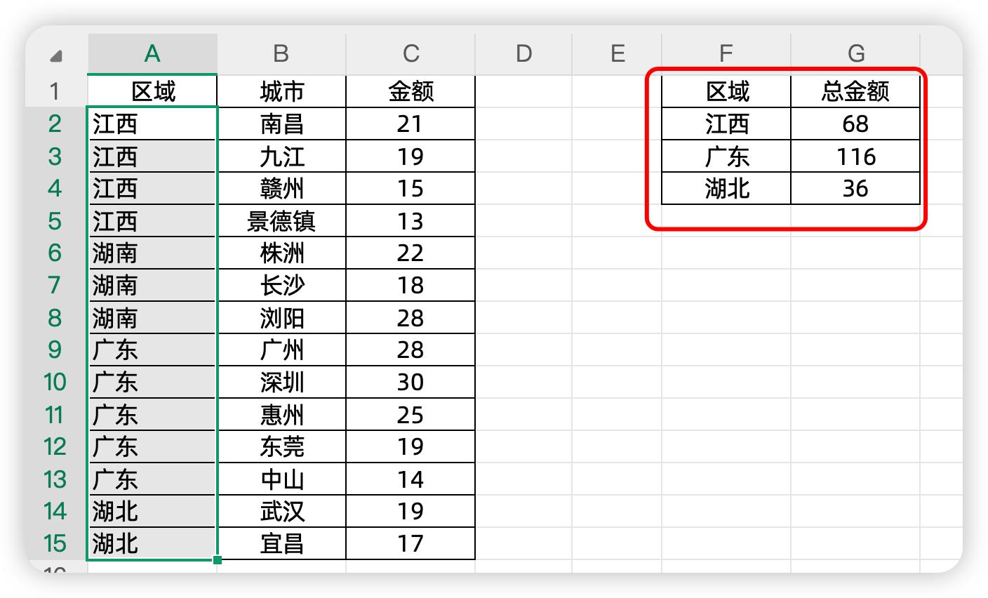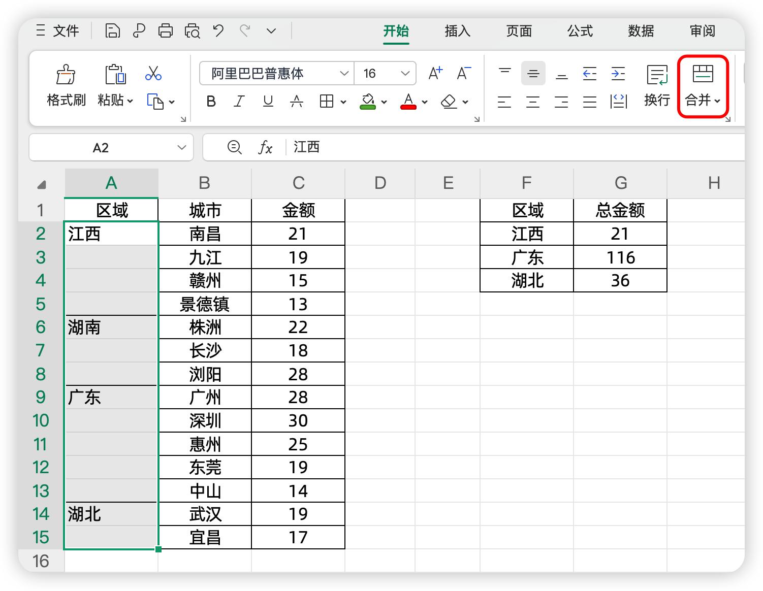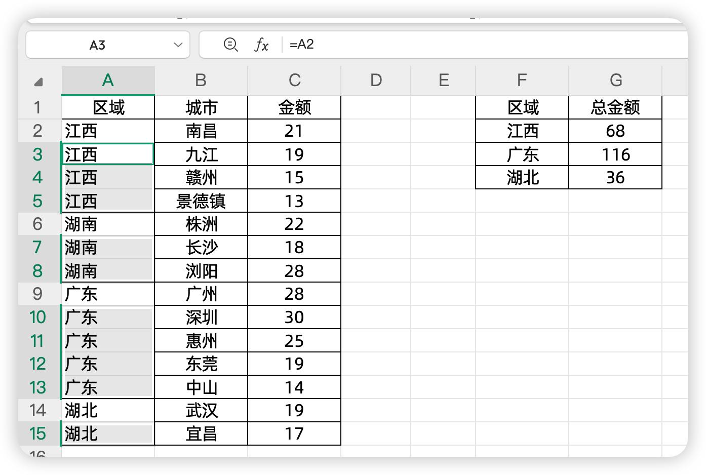 左边是公司各大区的销售金额情况,其中大区使用了合并单元格