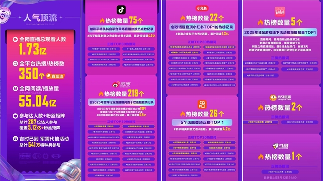 抖音话题播放量突破15亿,全网热搜/热榜超过350个,相关内容阅读量高达55亿。娱乐圈、文旅圈都能看到它的身影,品牌、玩家、明星在同一个舞台上互动,已经远远超越了“游戏圈自嗨”的范畴。