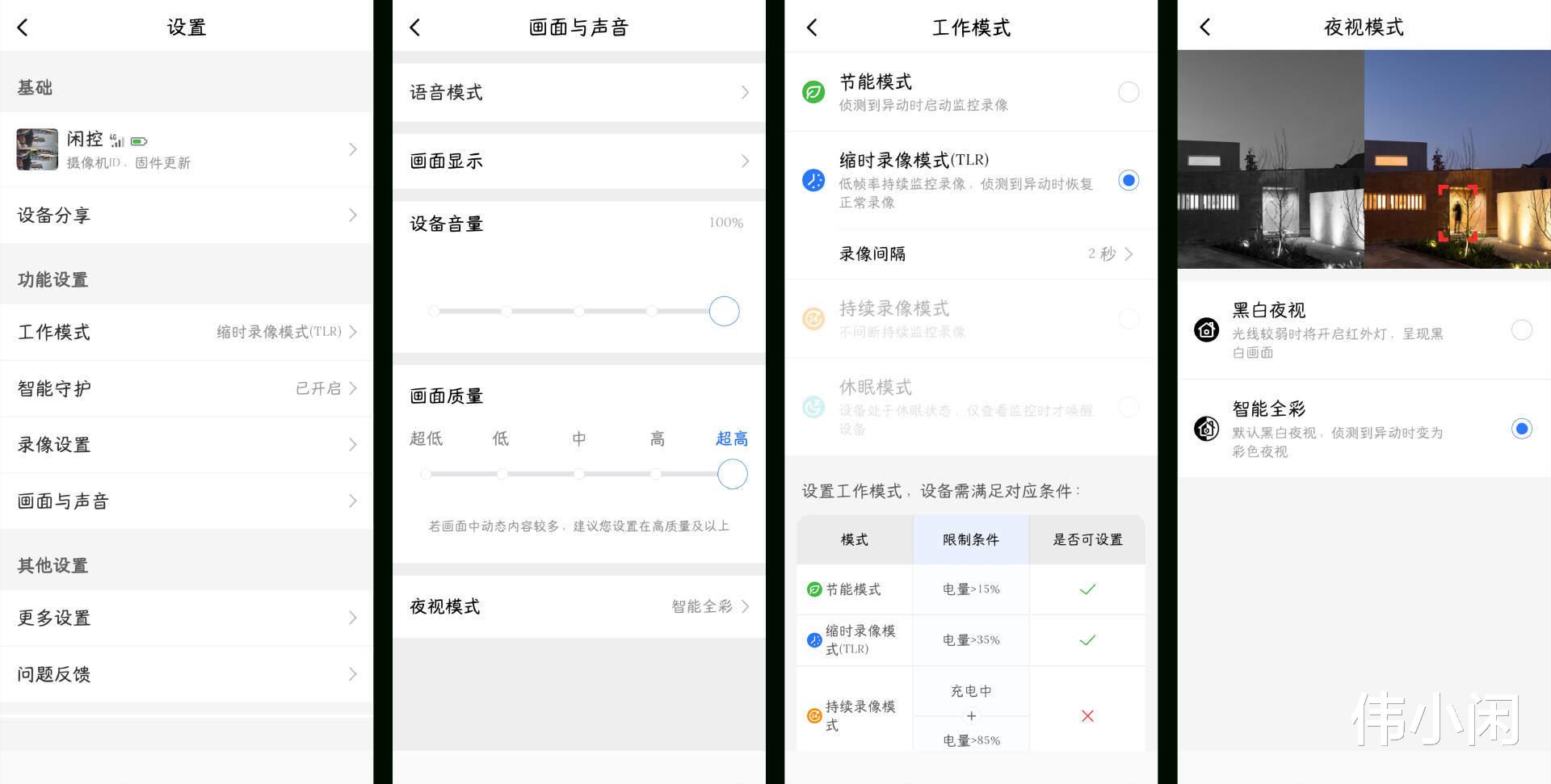 其中与鸿蒙联动的产品需要通过“智慧生活”App连接,本文摄像头产品为后者,需通过“小豚当家”App连接。进入App设置,摄像头的声音、画面、工作模式等选项都可以根据自身需求设置。我比较喜欢夜视模式这里的设定,“智能全彩”能保持在光线不是太好的夜晚,摄像头带来的仍然是多彩的视频效果。