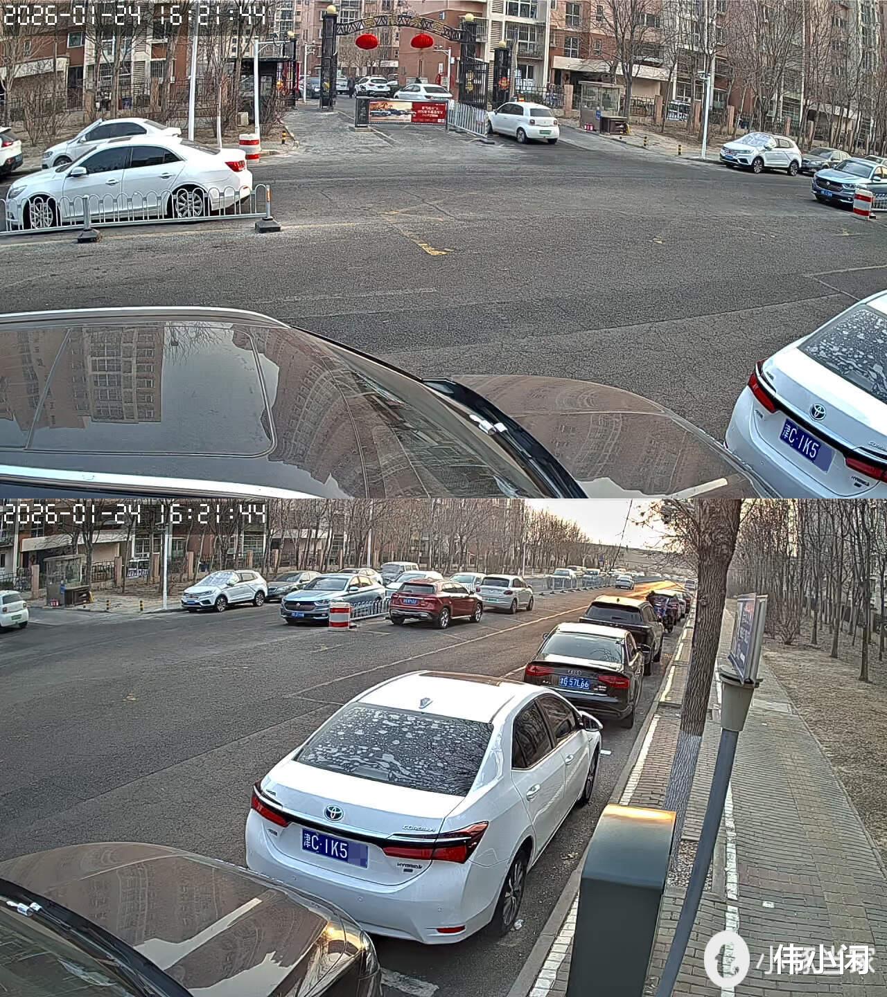 白天监控小区门口,偶尔调整一下云台角度,巡视一下周围情况,足不出户即可了解周边状况,科技改变生活真是太有道理了~车牌照也清晰可见。