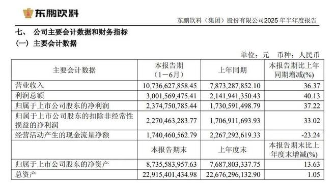 2025年上半年,东鹏特饮交出了一份足以震动行业的成绩单,数据显示,东鹏特饮2025年上半年实现营业收入107.37亿元,同比增长36.37%。归属于上市公司股东的净利润23.75亿元,同比增速达37.22%。