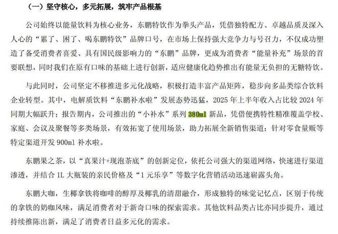 最新的2025年半年报显示,东鹏特饮占比降至77.91%,电解质饮料东鹏补水啦占比13.91%,茶、咖啡等合计占比8.18%,这种1+6的产品矩阵成效显著,更侧重健康化创新与场景化细分。