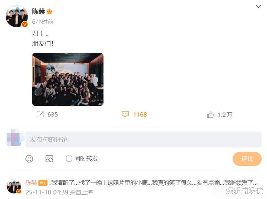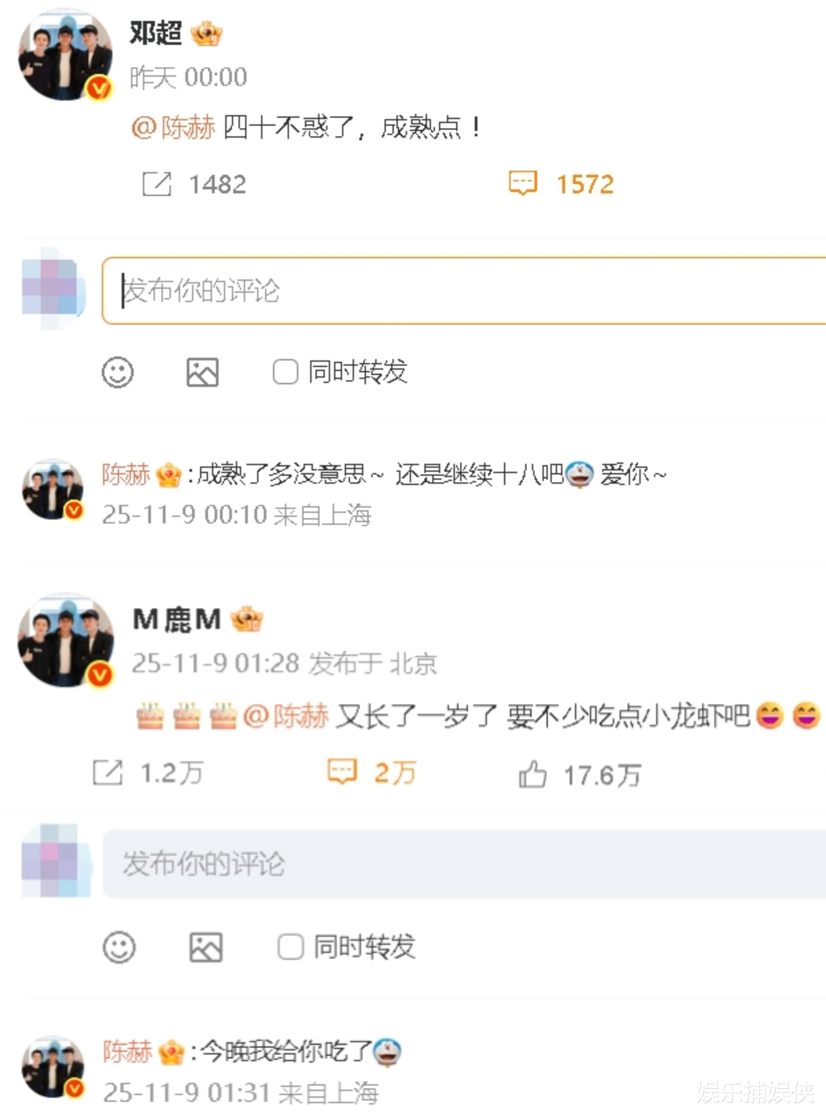 凌晨的时候,邓超和鹿晗这对“活宝兄弟”就迫不及待地发博给陈赫送祝福。邓超一本正经地说:“四十不惑了,成熟点!”仿佛在以老大哥的身份语重心长地叮嘱,可这语气里又藏不住那股子调皮劲儿。鹿晗则更逗,直接来了一句:“要不少吃点小龙虾吧😄”,这哪是祝福啊,分明是在调侃陈赫那吃货属性,毕竟陈赫对小龙虾的热爱,那可是人尽皆知,妥妥的“小龙虾狂魔”!