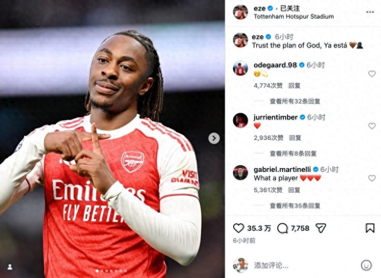 赛后,埃泽社媒晒照,一个十字手势,埃泽在阿森纳的号码就是10号,并如此配文:相信上帝的安排,一切已有定数。