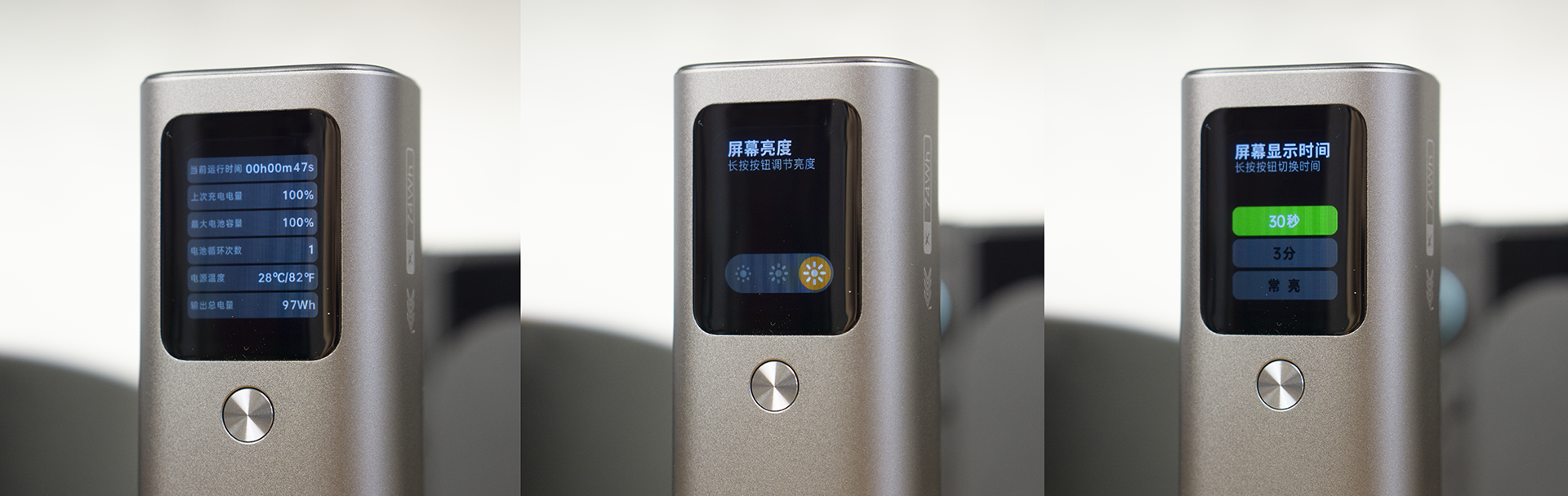 通过点按这个圆形的金属按键,我们可以让这块屏幕显示不同的信息,支持中英显示。除了剩余电量之外,它还可以显示充电宝当前情况的细节并可以调节屏幕亮度及屏显时间。