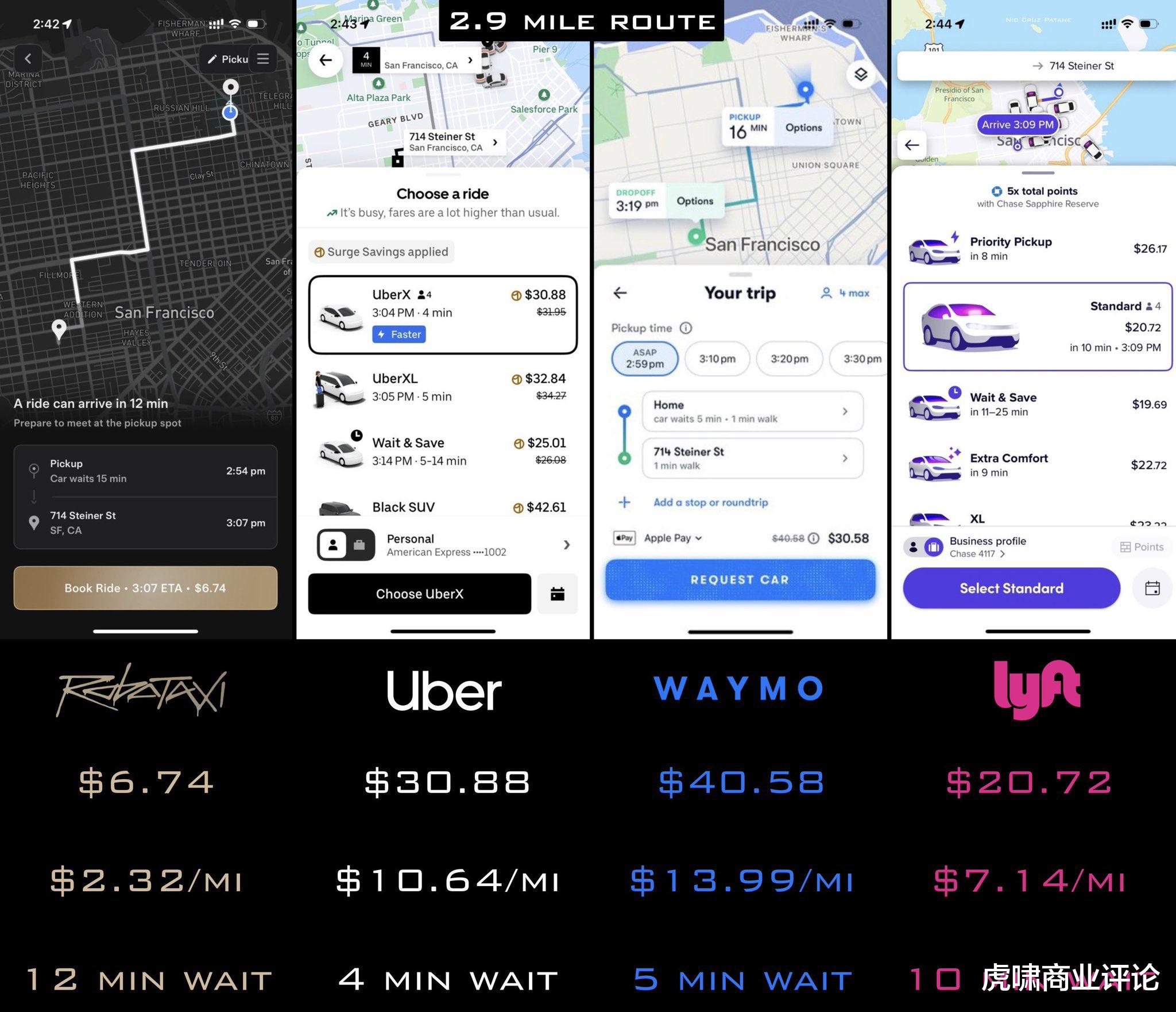 这是试验者在旧金山一个繁忙的周日做的一个横向测试,在等待时间差不多的情况下,同样的车程距离,6.74美元对应30.88美元(Uber)、40.58美元 (Waymo),20.72美元(Lyft),Robotaxi 的价格实现了对Uber、Waymo和Lyft的碾压。