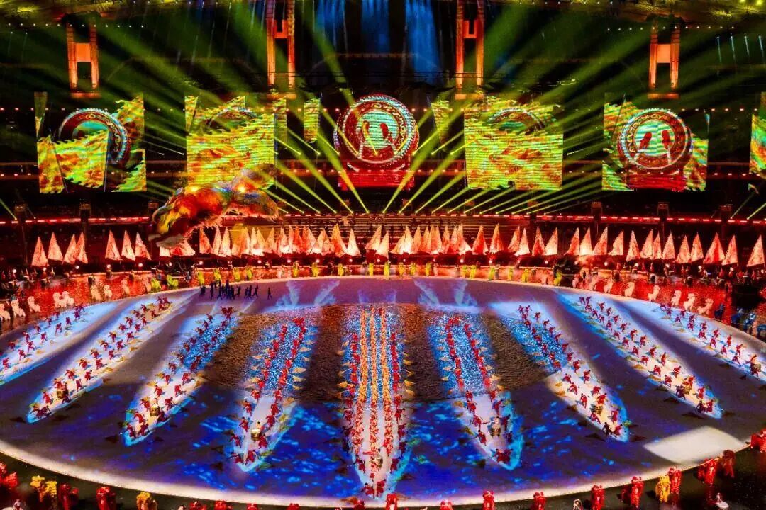 机械与虚拟交互:百头机械醒狮随鼓点变阵,通过 VR 技术实现与虚拟场景的实时互动;英歌表演搭配全息投影,重现海上丝绸之路盛景;