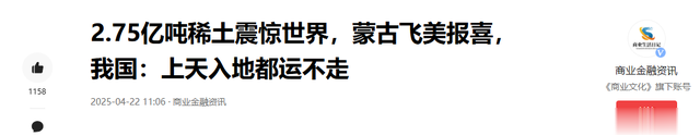 ( 信息来源:商业金融资讯 2025年04月22日 —— 2.75亿吨稀土震惊世界,蒙古飞美报喜,我国:上天入地都运不走 )