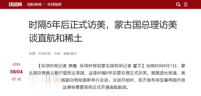 ( 信息来源:环球网 2023年08月04日 —— 时隔5年后正式访美,蒙古国总理访美谈直航和稀土 )
