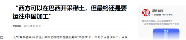 ( 信息来源:观察者网 2025年04月17日 —— “西方可以在巴西开采稀土,但最终还是要运往中国加工” )