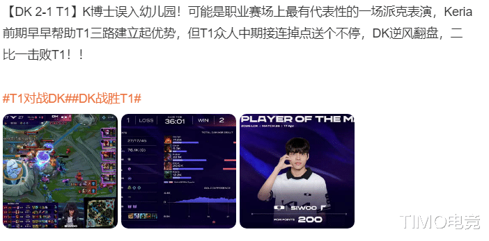 Doran的纳尔在3-0领先的情况下,小龙团白送一波,TP回线又死一次。Faker中路被ShowMaker蛇女死死压制,中野联动彻底瘫痪。DK完成惊天翻盘,T1以1-2再吞一败。