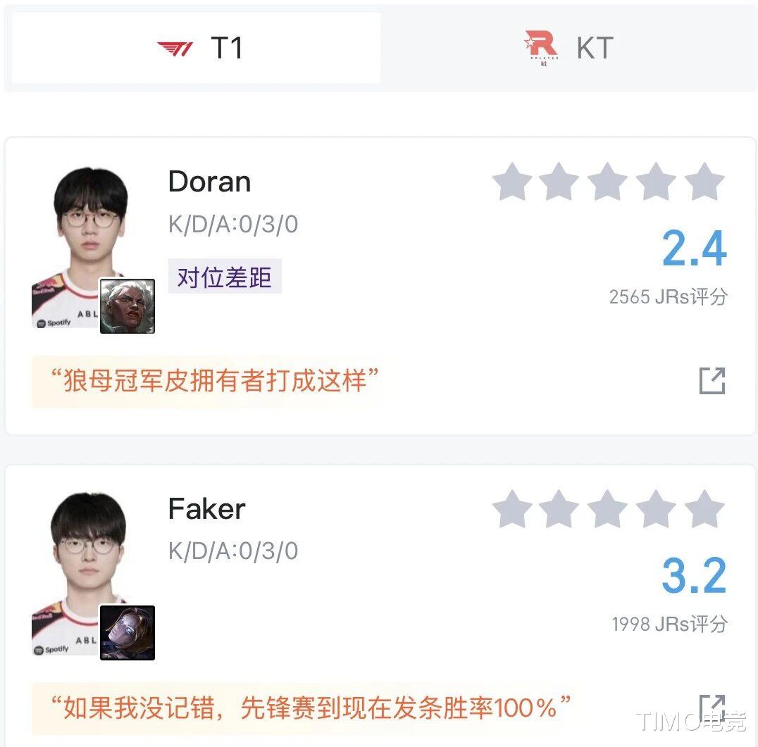 第一局,T1被KT打了一个12-0。 全场一个人头没拿到,五个位置全部被打穿。Doran狼母被PerfecT对位单杀,Oner皇子全场伤害2.2K“致敬小虎”,Faker的发条被Bdd无限针对,全场隐身。第二局27比12,KT再下一城,T1被横扫。