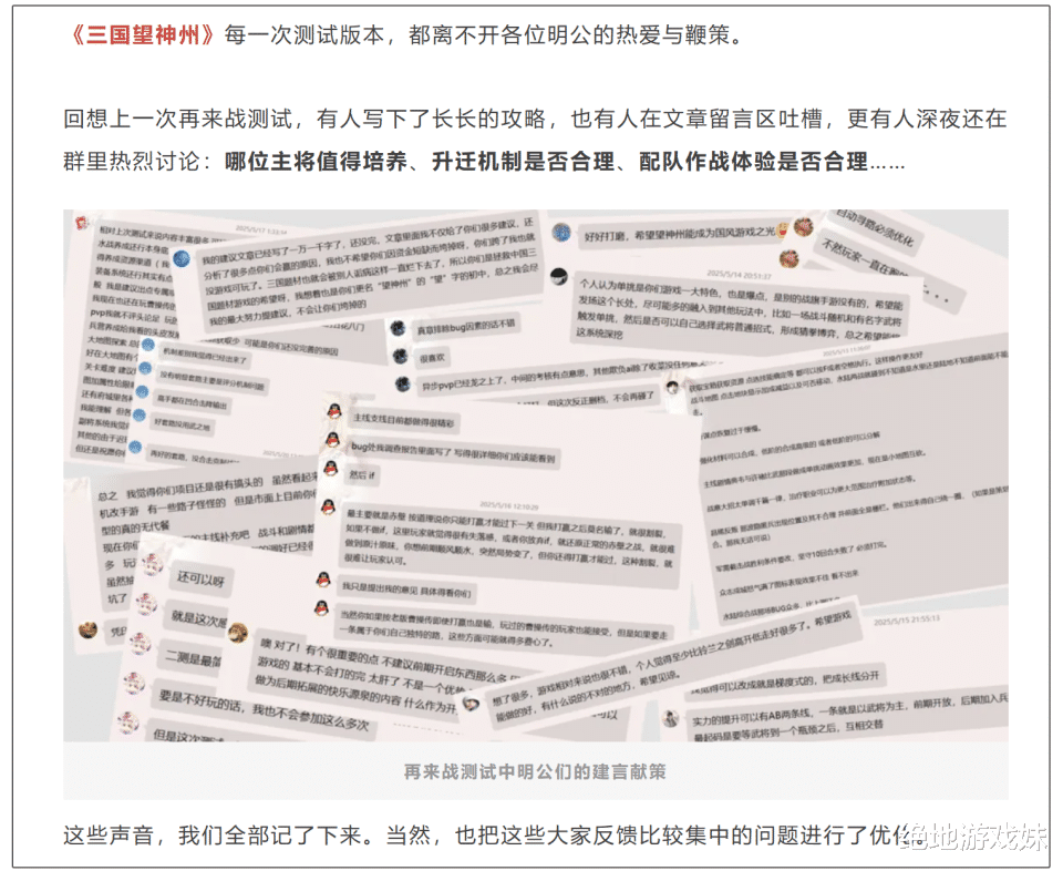 《三国望神州》两次测试均获得玩家90%的好评,但是在好评之外,玩家踊跃给策划提出优化意见,没想到在第二次测试中,官方一下优化了上百条内容。