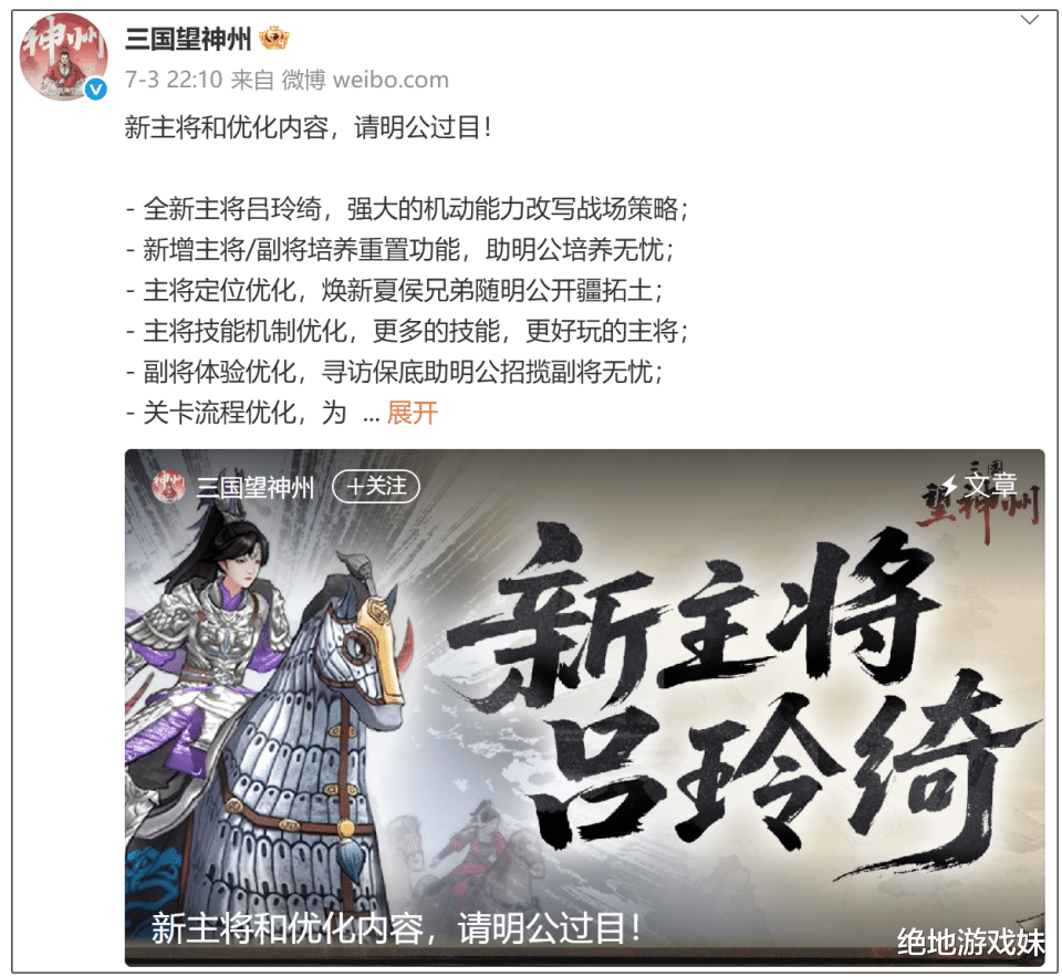 除了一个月一下拿出了上百项优化,《三国望神州》开发新内容也没有闲着,“争锋测试”新增了武将吕玲绮,作为吕布之女,她的出场自带BGM。