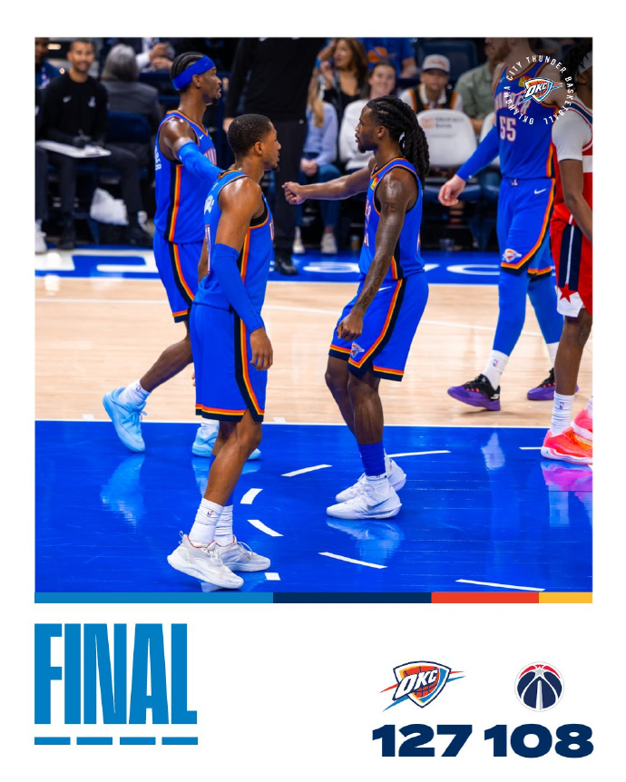 雷霆今天在主场以127-108大胜奇才,开局豪取六连胜,继续保持不败金身。除了雷霆,目前也只有三支球队还没有输过,分别是马刺、76人、公牛。值得一提的是,雷霆上赛季也曾取得开局7连胜,他们接下来也有望打破上赛季的纪录,要是一直能保持这样的势头,他们甚至有可能打破勇士的73胜纪录。