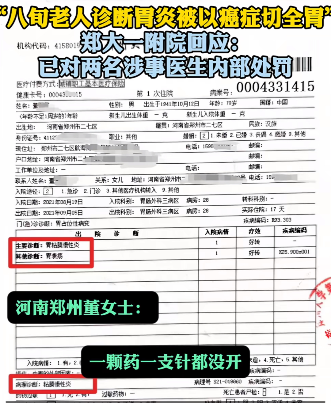 听到这番话的女儿董大姐,二话不说,直接带老父亲去了当地最大的三甲医院——郑州大学附属第一医院,挂了一个胃肠外科专家号。