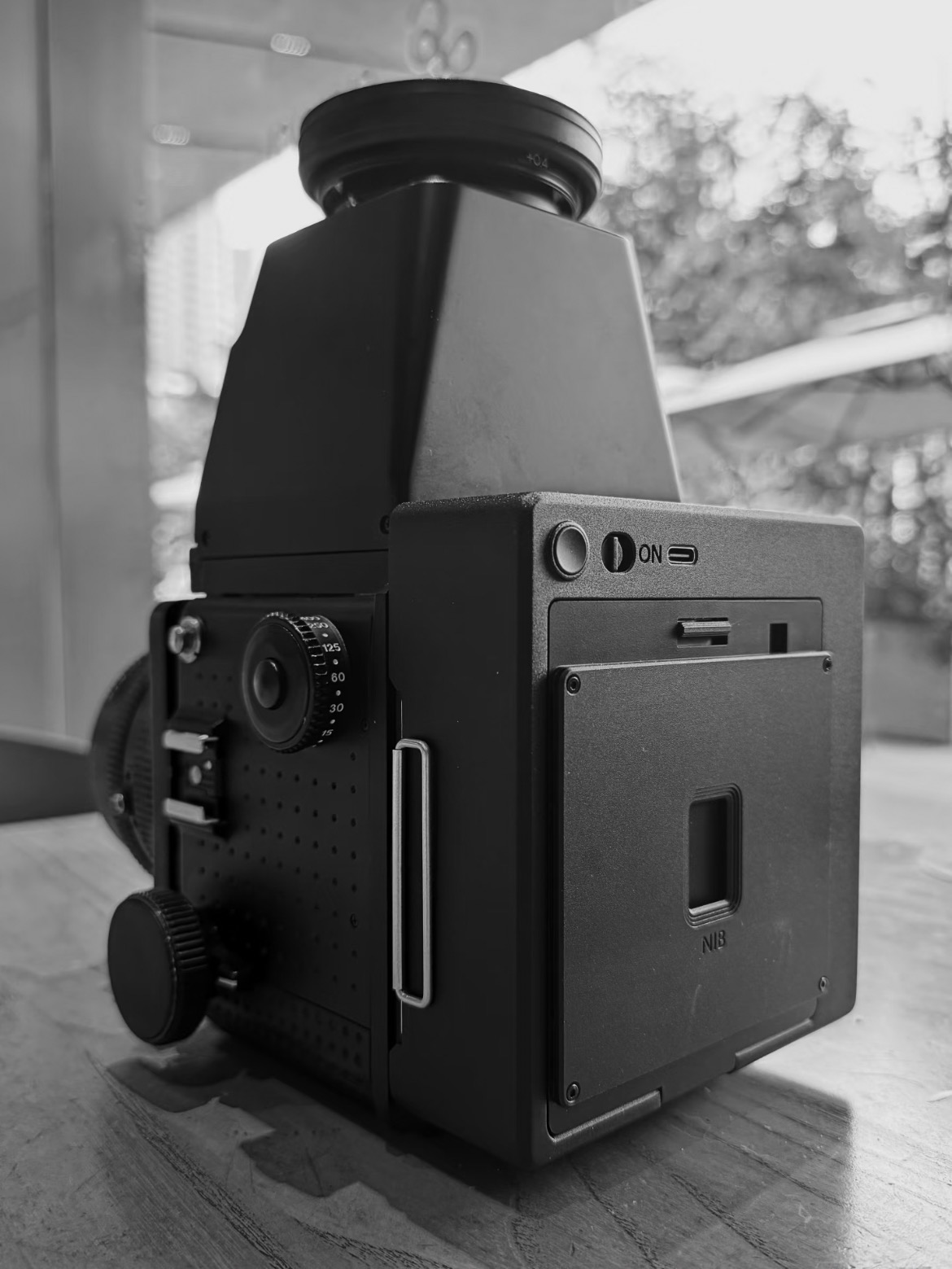 玛米亚RZ67中画幅胶片机,搭载NONS拍立得后背。机械的精密结构与即时成像的仪式感,在黑白基调中达成理性融合。
