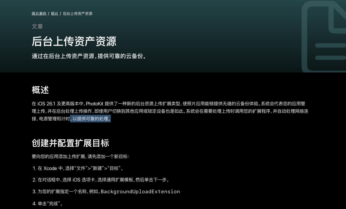 根据开发者文档,iOS 26.1 的 PhotoKit 接口,新增了 “后台云备份”的功能。
