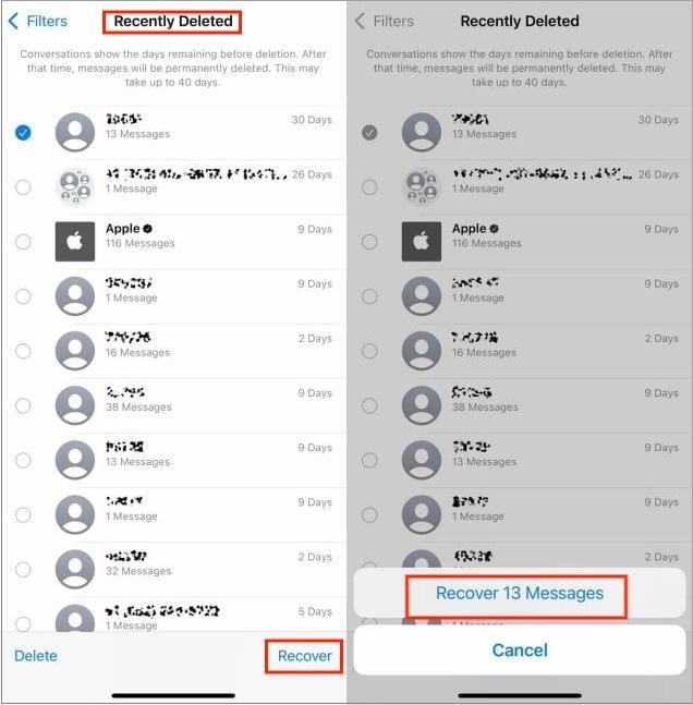 如果您刚刚删除了 iMessage 对话并且使用的是iOS 16 或更高版本,则可以从“消息”应用中的“最近删除”部分轻松恢复它。它允许用户在删除后 30 天内恢复已删除的消息。