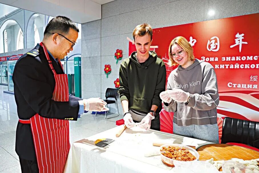 下图:黑龙江省绥芬河火车站「中国年俗体验角」,俄罗斯游客体验包饺子(图源:新华社)