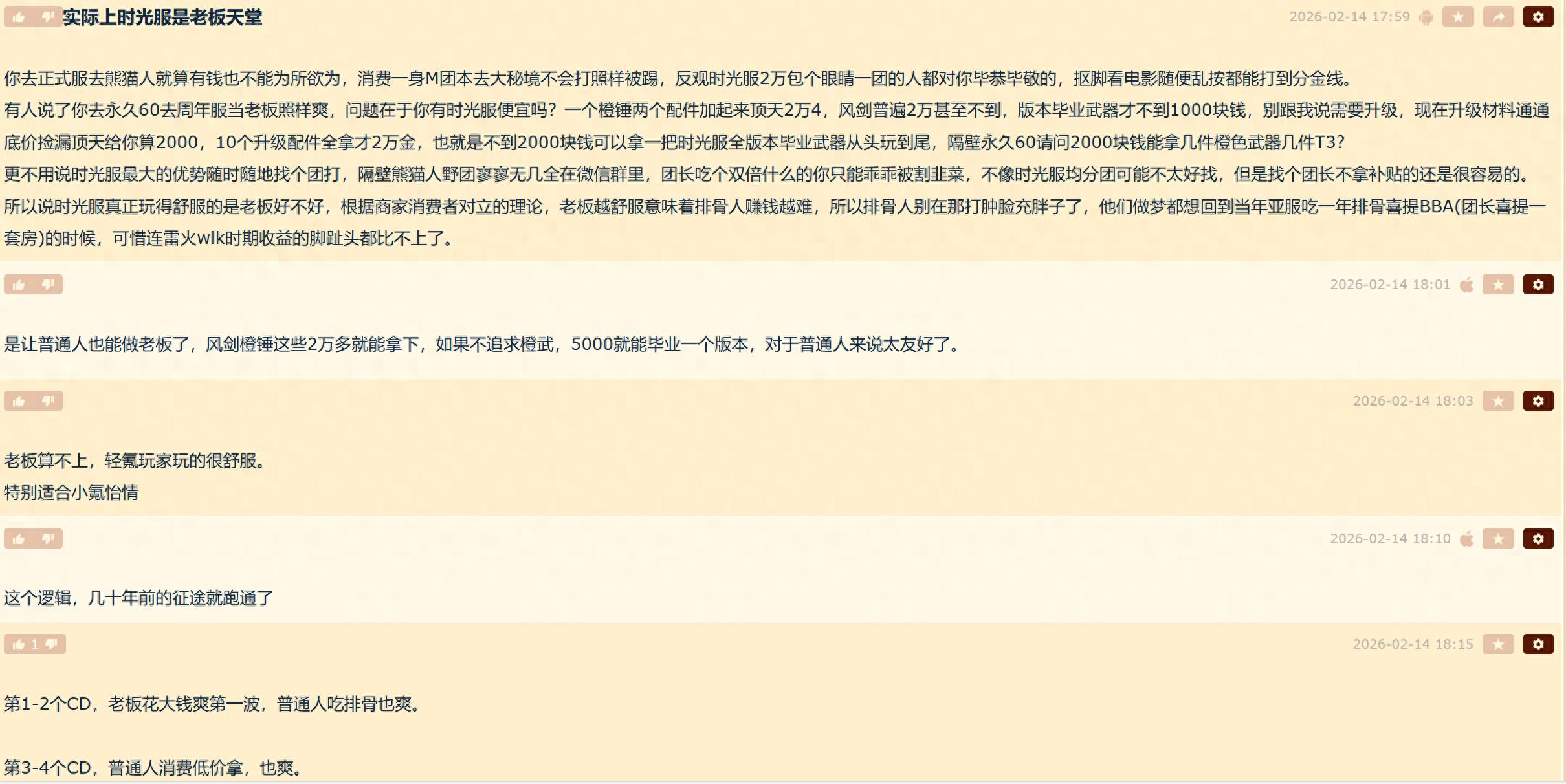 如何总结这句话呢?便宜。玩家们可以花费较低的价格去拿到魔兽世界时光服的BIS装,因此不管是什么玩家其实都可以体验到做老板的快乐。也有玩家总结说,前两个CD,普通玩家吃排骨就好了,毕竟老板高价拿装备,而后面几个CD普通玩家快速消费,用较低的价格拿装备,这样的话,团也不至于没有人消费。总结就是大家都舒服。