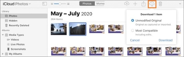 步骤 5. 点击“下载”按钮,选择“未修改的原图”或“最兼容”,然后点击“下载”开始将照片从 iPhone 传输到电脑。