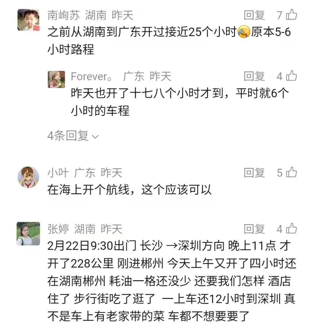 有网友表示,原本6个小时的车程,现在得开将近20个小时;也有网友崩溃道,用了13个小时还没出湖南,想回深圳还要再开12个小时……