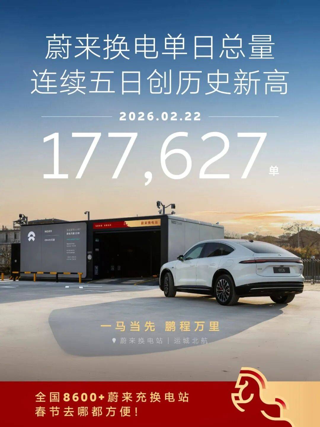 今年春节,蔚来换电总量连续5天创下历史新高。最多的仙人山服务区换电站,甚至在1天之内换出了193块电池,和超过8600座换电站一起,为用户出行提供能源保障。
