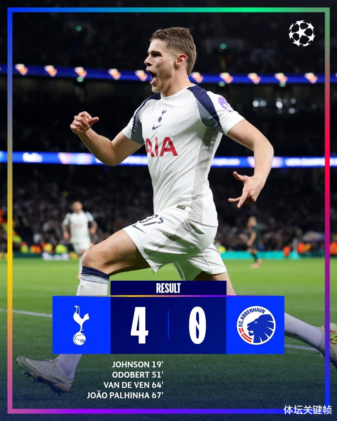尽管布伦南·约翰逊被红牌罚下,热刺仍凭借统治级表现大胜哥本哈根,延续了本赛季不败战绩。