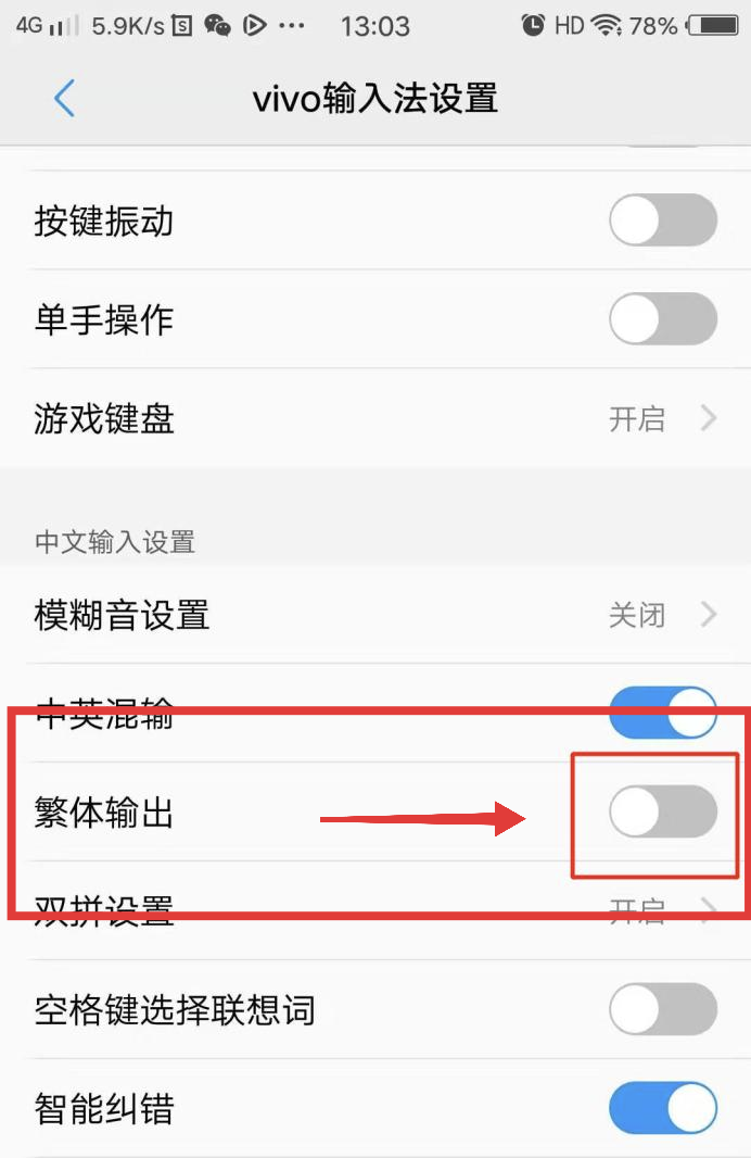 4.最后进入到vivo输入法设置页面后,把“繁体输出”的按钮关闭即可了。