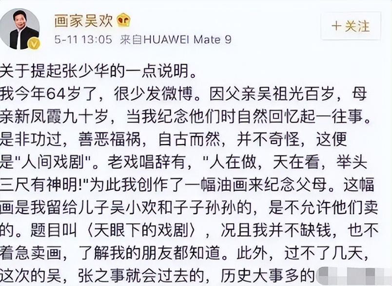 几乎同一时间,画家吴欢在微博上发出悼念,两家几十年的恩怨似乎在这一刻终于得到和解。