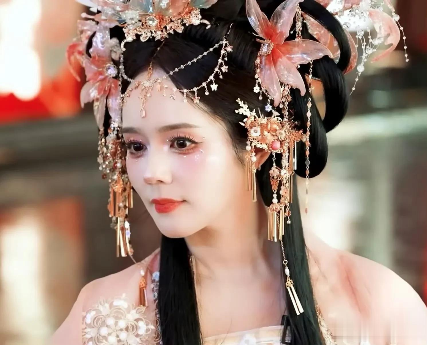 浓重的眼影和腮红,夸张的假睫毛,廉价的头饰和着装,完全没有了大美人原有的样子。