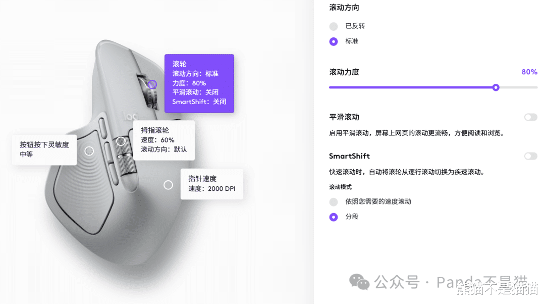 外观差不多就这样,整体其实在使用习惯之后还是非常舒服的,侧面的拇指键需要一定时间来适应力度,同时也可以在Logi Optinos+设置按压强度和反馈来调整到自己最合适的档位。
