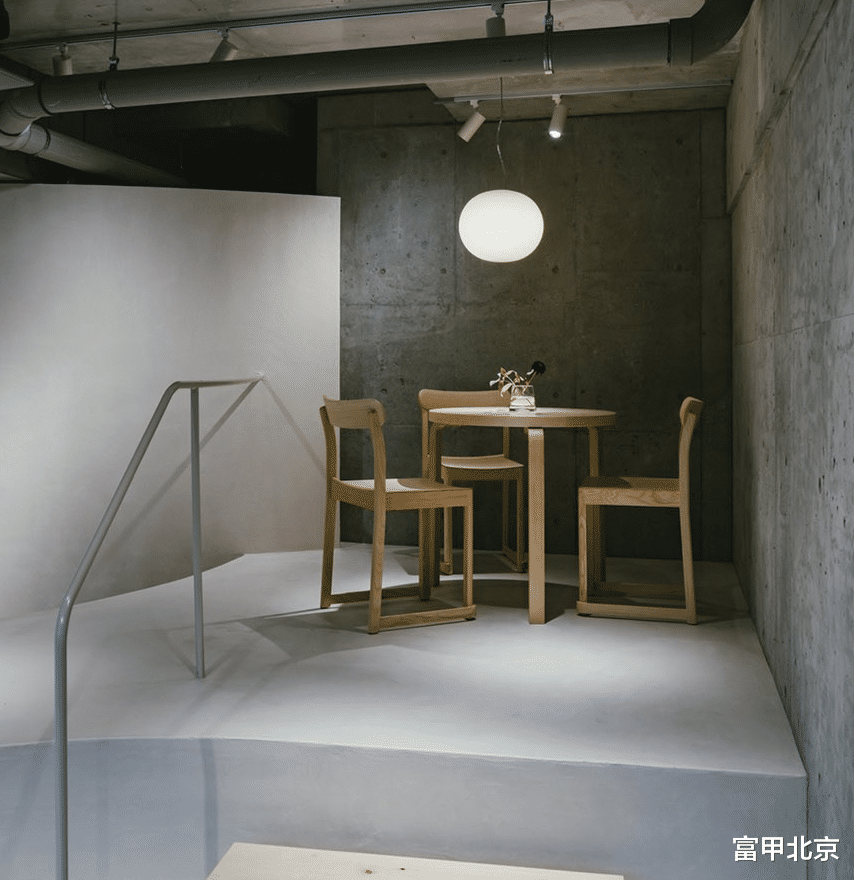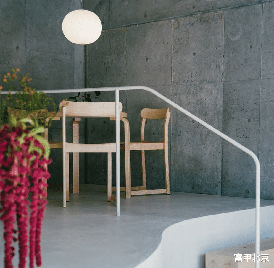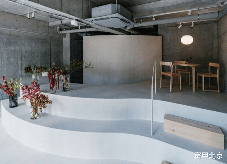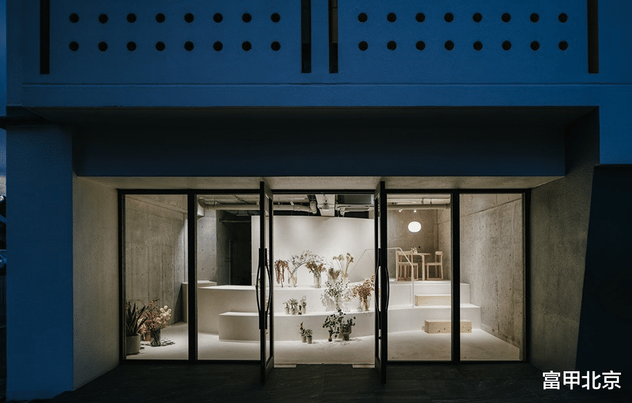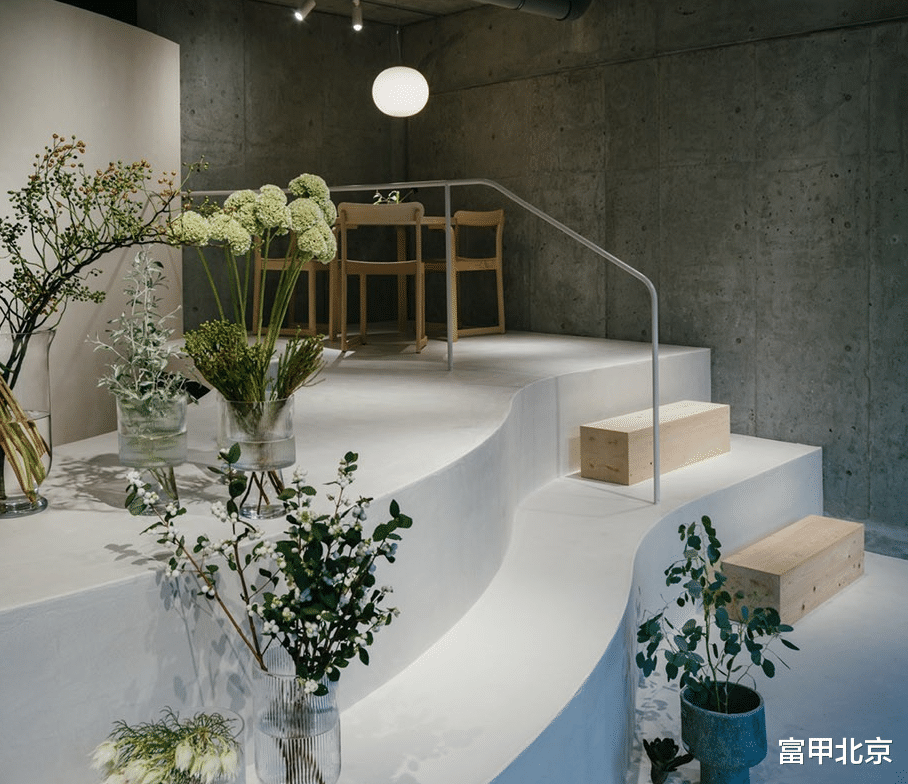不同的高度差和花卉的布置在心理上起到了微妙的划分作用,使得上层的会客区成为一个放松的空间。店铺后方的吊灯罩投射出柔和的光线,吸引视线向后方延伸,强调了空间的深度和高度。