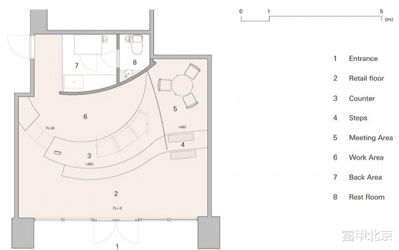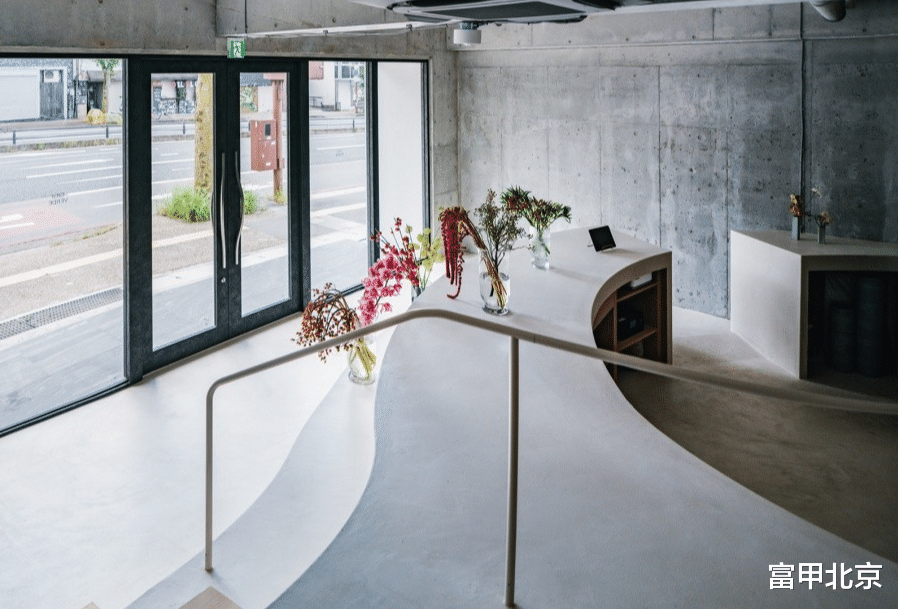 为满足这些需求,设计方案将室内地面从入口处无缝延伸到主柜台,并设置一个小型夹层。墙面涂抹土色调,流畅的曲线造型灵感来源于奈良的盆地和山脉地形,形成了一个背景,突出了花卉的自然色彩和形态。工作区足够宽敞,可供多位花艺师同时进行花卉装饰,并且柜台下方(距地面950mm)和地板下都有充足的储物空间。