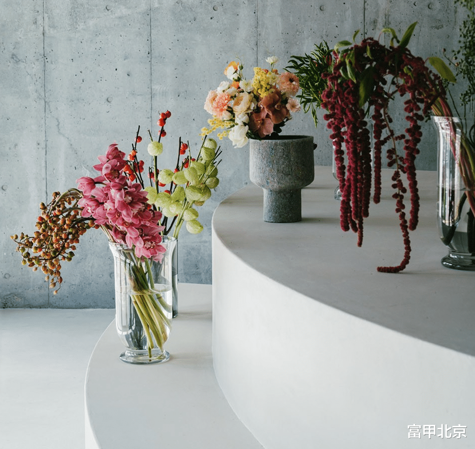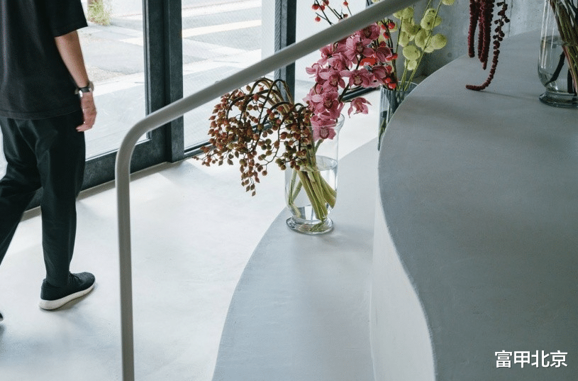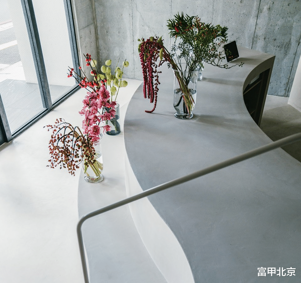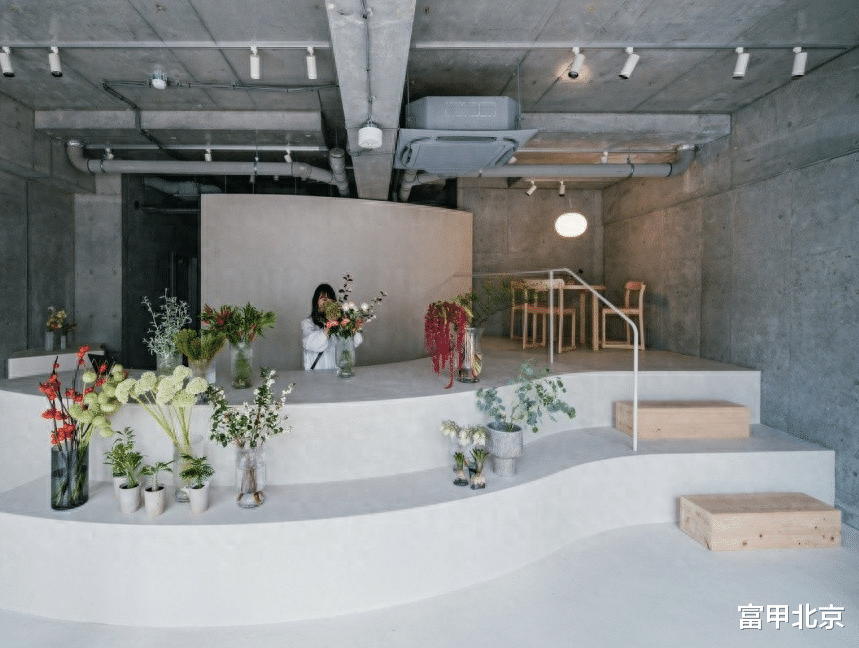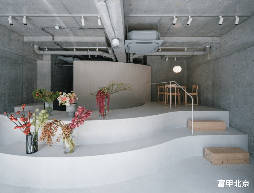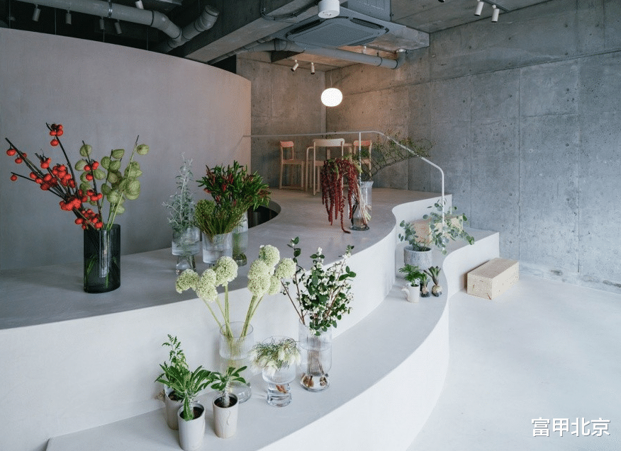 弯曲的阶梯展示柜吸引顾客进入店内,并能够容纳不同数量的库存。它也作为工作区,让顾客可以看到花艺师的创作过程,使这个空间既是工作室又是花店。