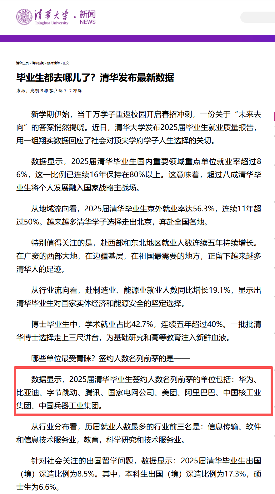 清华发布最新数据显示,25届清华毕业生签约人数名列前茅的单位包括:华为、比亚迪、字节跳动、腾讯等。