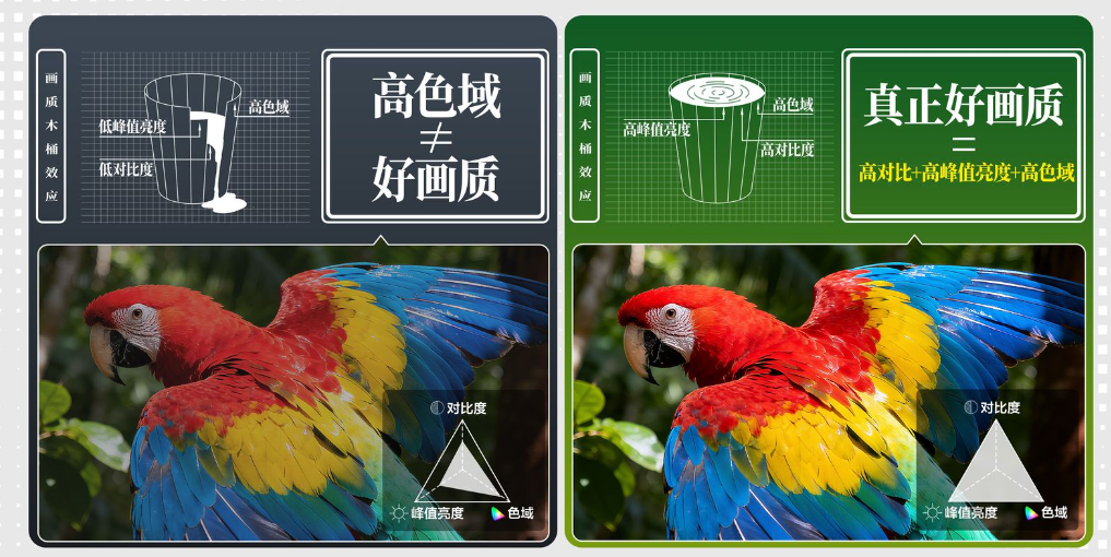 画质是一台好电视的根本,而高对比度、高峰值亮度、高色域所组成的“画质铁三角”,是好画质的核心标准。对比度决定明暗层次与细节,色域决定色彩丰富度与准确度,峰值亮度决定高光场景的真实感。当前Mini LED电视有SQD与RGB两大主流技术,在“画质铁三角”表现上,二者差异明显。
