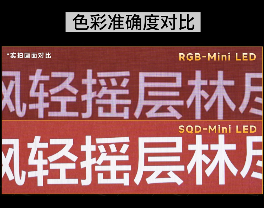 原理解释了这么多,下面直接上三组实测对比,更能反映二者间的差距。首先看第一组文字放大后的对比,主要体现二者在色准上的差异。RGB方案白色文字内容已经被染红,存在明显的串色现象。而且字体边缘也有些发虚。而SQD方案的文字依旧是白色,没有受到红色背景色影响,色彩明显更准。而且字体看起来明显更清晰。